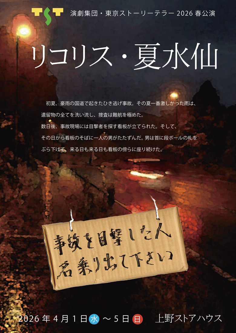 だから、東京ストーリーテラーは、舞台上の「語りべ」として、観る人の心の糧となるような、良い物語の上演を目指します。 幕が上がって下りるまでの短い時間だけ存在する芝居の世界、そんな世界の登場人物として生きる事に、役者は命がけで取り組みます。